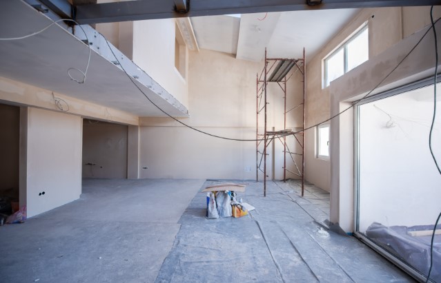 interior of construction site with scaffolding